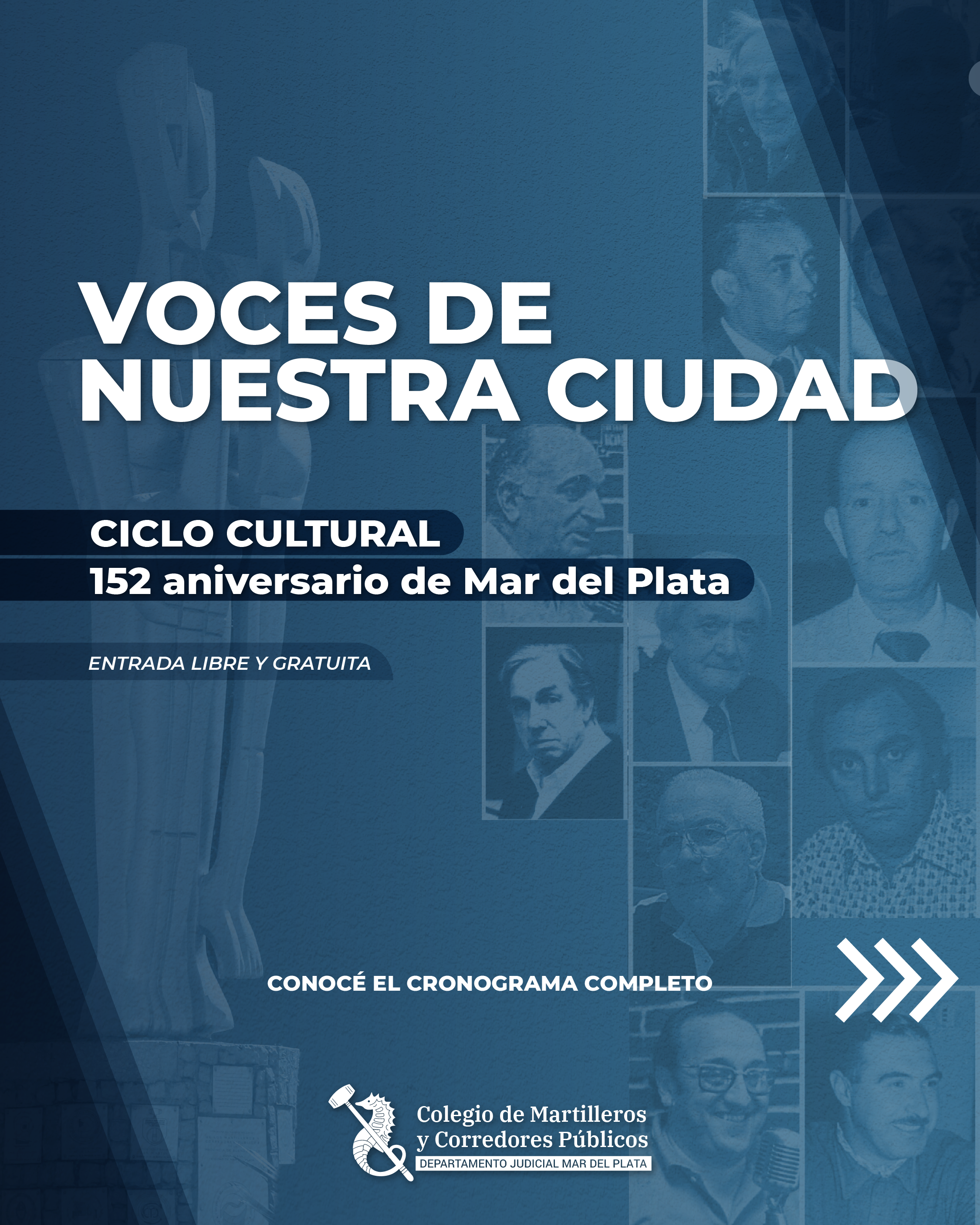 En el marco de las celebraciones por el 152º aniversario de Mar del Plata el Consejo Directivo del Colegio de Martilleros y Corredores Públicos de Mar del Plata invita a marplatenses y turistas al ciclo cultural “Voces de Nuestra Ciudad”.
