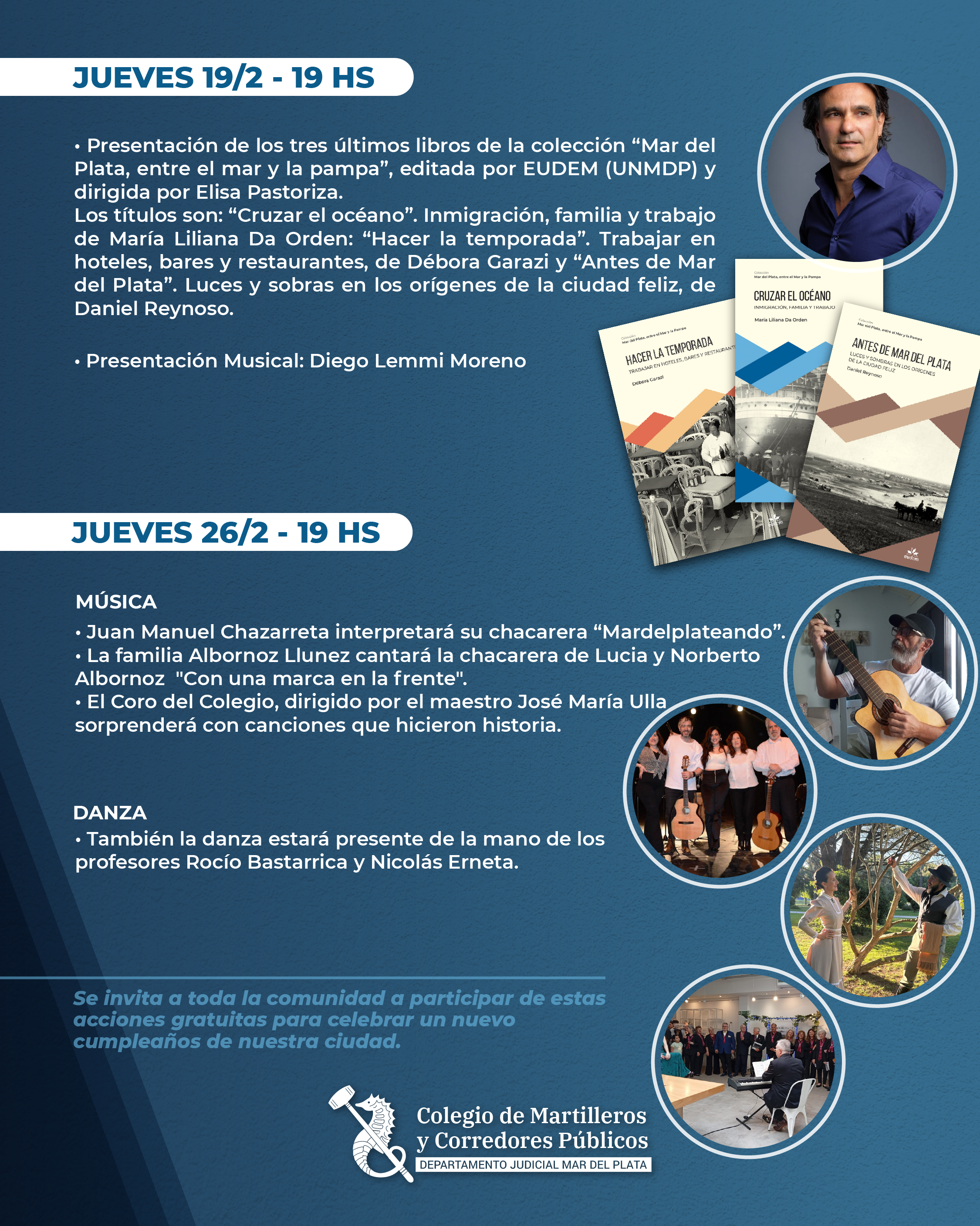 Y el cierre será el 26 a las 19 a toda música con temas relacionados a la ciudad: Juan Manuel Chazarreta interpretará su chacarera “Mardelplateando”; la familia Albornoz LLunez cantará la chacarera de Lucia y Norberto Albornoz  “Con una marca en la frente” y el Coro del Colegio, dirigido por el maestro José María Ulla sorprenderá concanciones que hicieron historia.