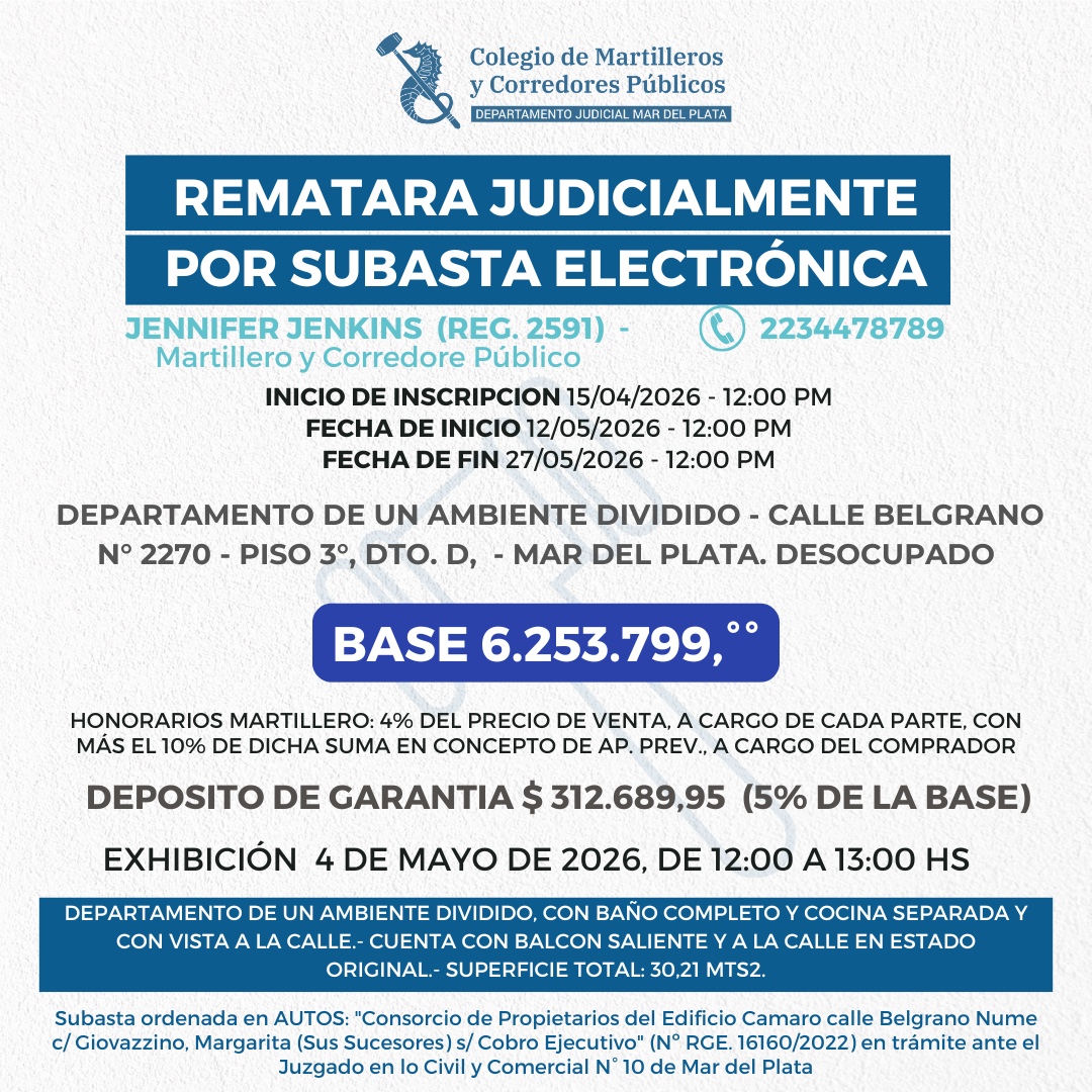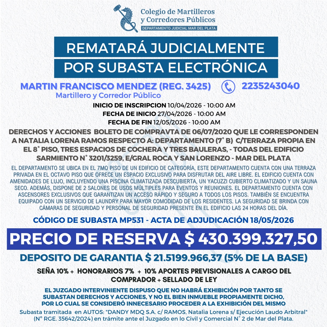 Subastas Subastas DERECHOS Y ACCIONES 27/04 12hs al 12/05 12hs Descargar edicto Info e inscripción Inmueble enBelgrano N° 2270 12/05 12hs al 27/05 12hs Descargar edicto Info e inscripción Inmueble en 3 de Febrero Nº2757 15/04 12hs al 29/04 12hs Descargar edicto Info e inscripción Inmueble en Bolivar Nº2470 22/04 12hs al 07/05 12hs Descargar edicto Info e inscripción Inmueble en Alberti Nº2032 25/03 10hs al 10/04 10hs Descargar edicto Info e inscripción 100% Derechos y acciones heredados 07/04 10hs al 21/04 10hs Descargar edicto Info e inscripción Derechos y acciones 06/04 10hs al 20/04 10hs Descargar edicto Info e inscripción Inmueble Felix Nº441 16/04 12hs al 30/04 12hs Descargar edicto Info e inscripción Inmueble en Entre Ríos Nº1740 11/05 12hs al 28/05 12hs Descargar edicto Info e inscripción 300 acciones correspondientes Pampa Alta S.A 10/04 12hs al 24/04 12hs Descargar edicto Info e inscripción Inmueble Falucho Nº2461 17/04 10hs al 04/05 10hs Descargar edicto Info e inscripción Cámara de Frío de Acero inoxidable 20/04 11hs al 05/05 11hs Descargar edicto Info e inscripción Heladera mostrador Marca Frider 20/04 10hs al 05/05 10hs Descargar edicto Info e inscripción Heladera mostrador batea de 3metros 20/04 09hs al 05/05 09hs Descargar edicto Info e inscripción +54 9 223 590-0002 493-5119/1189 Bolívar 2948, Mar del Plata info@martillerosmdp.com.ar Instagram Facebook Twitter Youtube InicioInstituciónColegiadosSubastasNoticiasEventosContacto